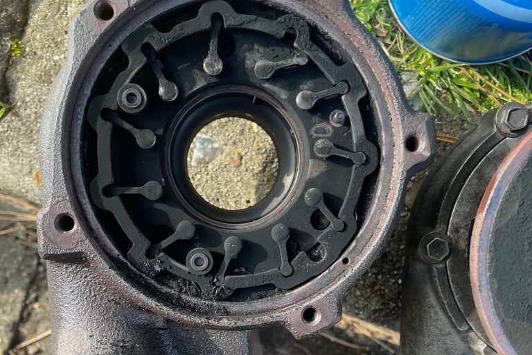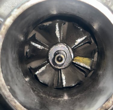 L'écrou du CHRA a été désolidarisé et aspiré par le turbo à cause d'un FAP bouché. Cette obstruction génère une pression excessive dans le système, perturbant l’équilibre du turbo et causant des dommages graves, comme le dévissage de composants essentiels.